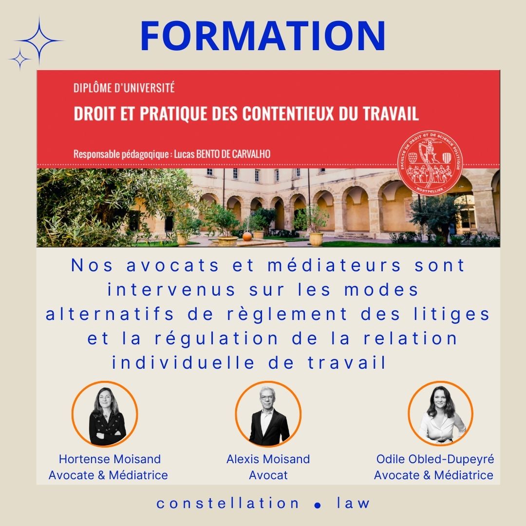 En janvier 2025, nos avocats experts en Capital Humain et Droit social ainsi qu’en Résolution de conflits Médiation et Contentieux, ont eu le plaisir d’ intervenir lors du DU Droit et pratique des contentieux, de la Faculté de Droit et de Science politique de Montpellier